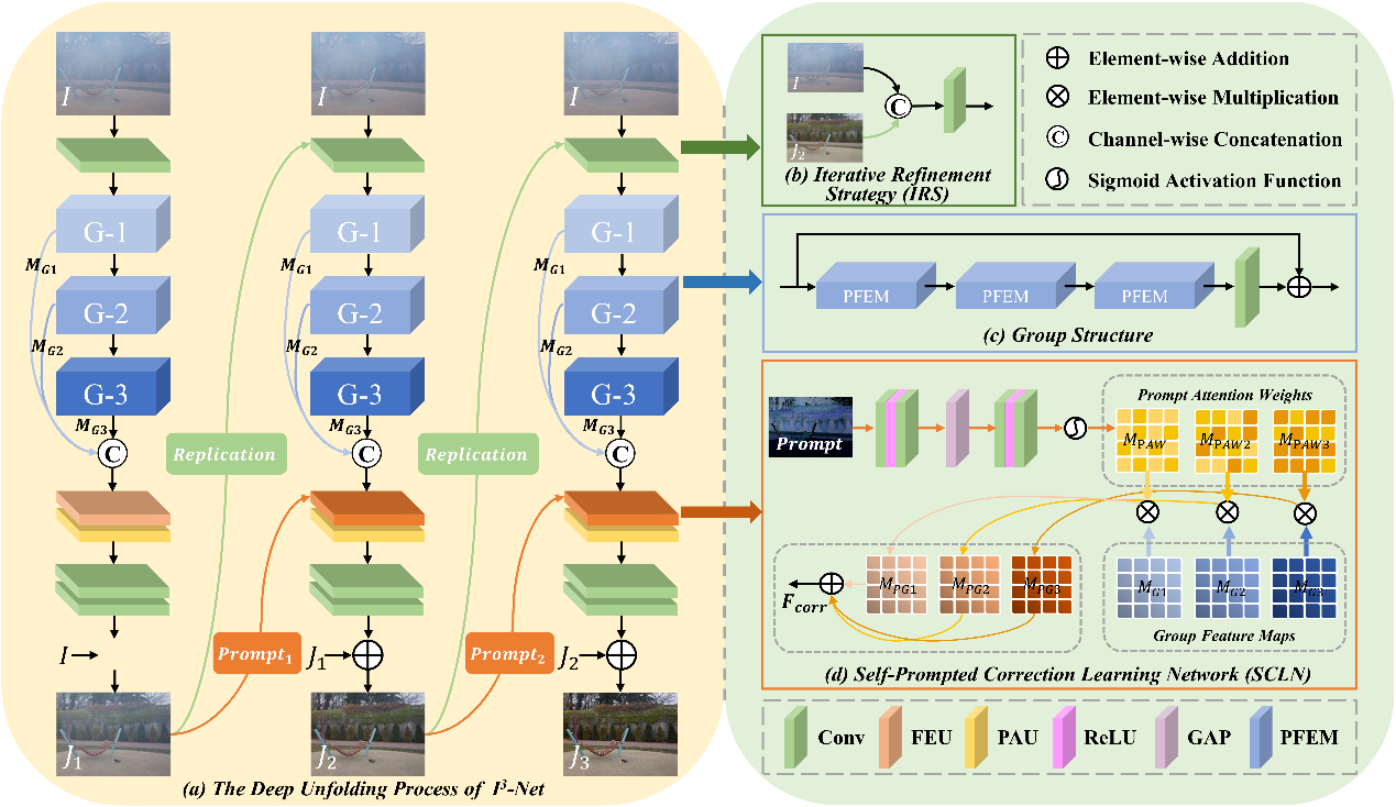 该论文针对复杂退化场景下去雾过程易产生误差累积和细节丢失的问题,提出了一种基于迭代精细化与自提示校正学习的深度展开去雾网络I3-Net。模型在深度展开架构基础上,采取迭代精细化策略(IRS)以实现清晰图像的逐级渐进式恢复,有效缓解单次前向传播的误差;同时引入了自提示校正学习机制(SCL),利用网络内部特征动态引导并校正迭代过程中的特征偏差。这种物理先验与自适应校正相融合的策略,实现了去雾特征的精准表达,显著提升了复原图像的清晰度与色彩保真度。