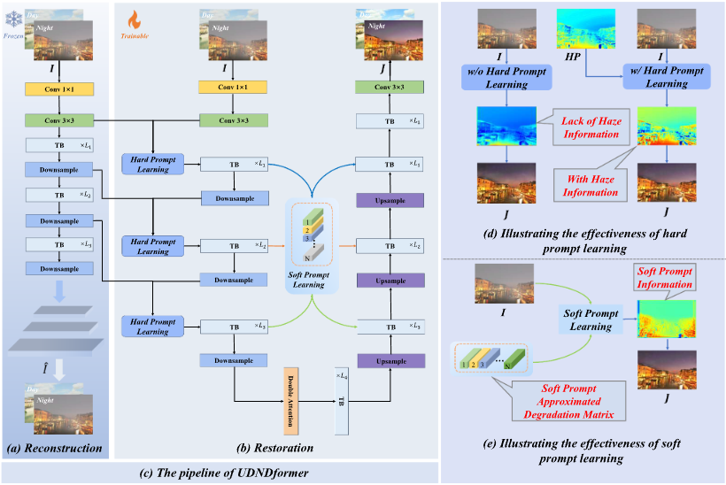 该论文提出统一昼夜去雾新范式UDND并设计了 UDNDformer,针对现有去雾方法长期存在的“昼夜分治”问题,构建单一模型同时适配白天与夜晚等多光照、多退化耦合场景。该方法以双提示机制促进跨域表征学习,在保证退化建模一致性的同时提升细节复原与泛化能力。实验结果表明,UDNDformer 在多个昼夜去雾基准上取得稳定领先表现,并在下游视觉任务中验证了其对高层感知的积极增益,具备良好的真实应用价值。