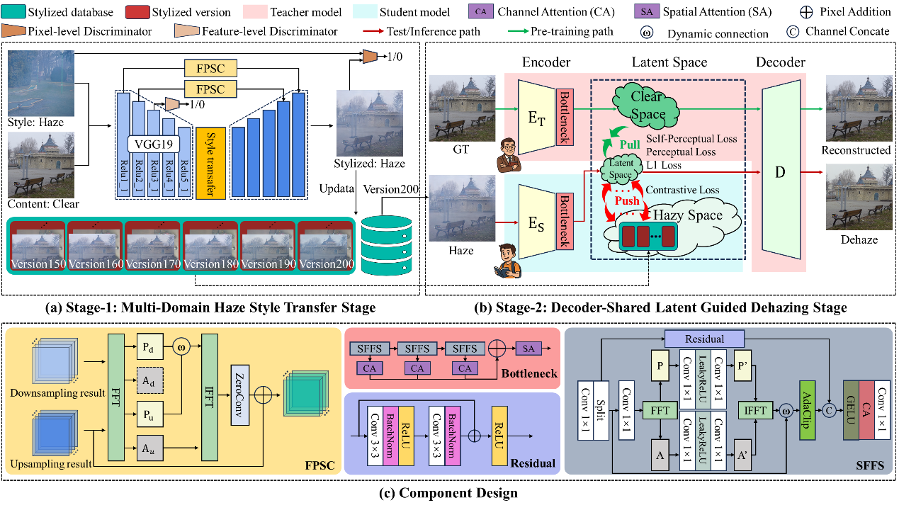针对现实世界中雾气呈现的多域特性(如非均匀雾、夜间彩色雾等),现有去雾方法往往因忽视不同域间雾特征的差异,导致在复杂异质雾条件下的去雾性能受限。围绕这一关键问题,论文基于在傅里叶域中的关键发现,提出了一种新颖的两阶段弱监督图像去雾框架 MDST-Dehaze,旨在通过精准捕捉并迁移特定域的雾分布,实现对多样化雾气场景的针对性去除。该论文首先利用傅里叶先验引导的风格迁移生成高质量且能有效丰富域间及域内雾气多样性的伪雾图像;随后基于教师-学生模型与对比学习,引导学生编码器在潜空间中学习无雾的特征表示,从而完成去雾任务,并由预训练的共享解码器重构出清晰图像。实验表明,该方法在RESIDE-SOTS、I/O-Haze、BeDDE和NHR等多个数据集上显著优于现有代表性方案,尤其在复杂场景的色彩保真与纹理恢复上表现卓越,为真实世界多域去雾提供了新的技术范式和思考。