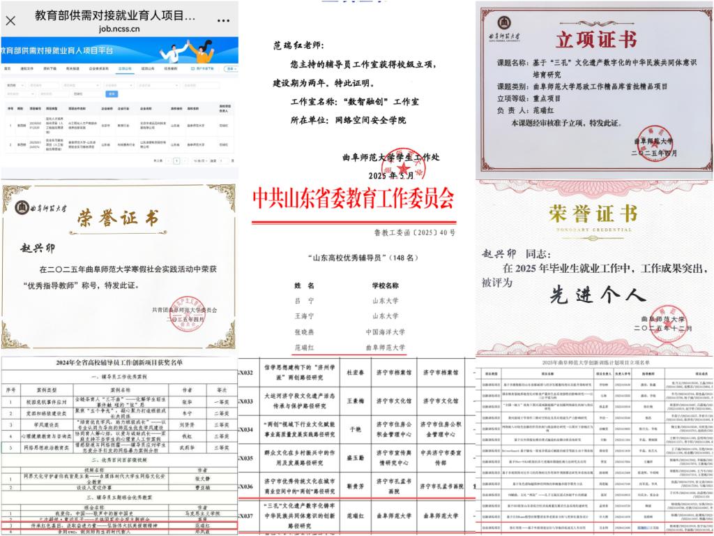 这支队伍各怀绝技、各有专攻,在育人领域绽放光彩:范瑞红主持2项教育部供需对接就业育人项目,并依托校级“数智融创”辅导员工作室,将就业指导深度嵌入人才培养全过程,获评学校就业工作优秀成果奖;主持1项济宁市社会科学规划研究项目、主持1项曲阜师范大学高校思想政治工作首批精品项目;获评山东高校“十佳百优辅导员”称号、1项山东省高校辅导员工作创新项目辅导员主题班会优秀教案。于媚媛被评选为“我最喜爱的曲园好教师”、军训工作“优秀指导员”。洪亚玲撰写的工作案例荣获全国高等师范院校学工部长工作年会成果一等奖;相青在诚信教育主题班会展示活动中荣获教案一等奖和视频一等奖。武玉龙获山东计算机党建与科技创新优秀成果奖二等奖。张晗获得辅导员素质能力大赛三等奖。在全校“我与曲园共奋进”辅导员论坛中,团队更是斩获一等奖4项,二等奖3项,三等奖3项,实现全员参与并获奖。3名辅导员在就业工作中获评先进个人。荣誉背后,是深夜办公室的灯光,是考研前夕的每一句鼓励,是就业季“永不掉线”的答疑解惑。他们以扎实的专业能力为学生成长赋能,以无微不至的温情守护学生心灵,构成了一个目标同向、协同高效、充满归属感的育人共同体。