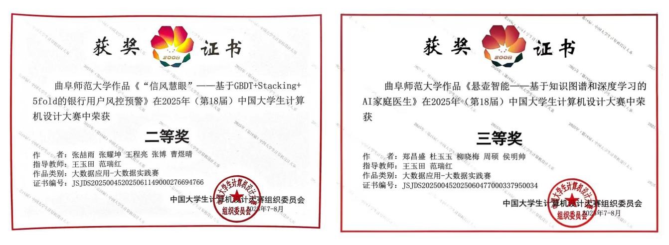 18届中国大学生计算机设计大赛中,指导的两项作品分别荣获国家级二等奖、三等奖。