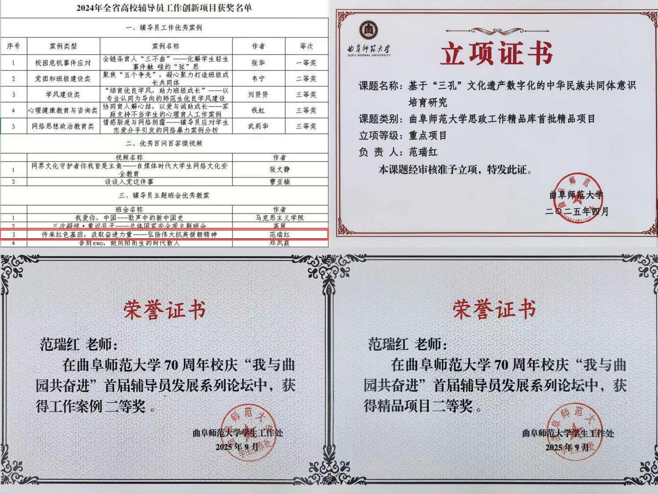 数字人文的探索深度融入日常思政工作,让育人实践更具人文情怀,也为思政教育注入了活力,结出了扎实的育人硕果。20254月,我申报的主题班会教案《传承红色基因,汲取奋进力量》,获评山东省高校辅导员工作创新项目优秀教案;主持的《数字赋能传文脉・文化铸魂育同心》项目,入选学校2025年思想政治工作首批精品项目;在“我与校庆共奋进”首届辅导员发展论坛中,亦收获工作案例二等奖、精品项目二等奖各1项。