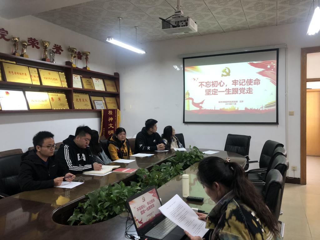 研究生党支部举行“不忘初心、牢记使命”主题教育对照党章党规找差距专题会议,党支部书记王抒同志主持会议。