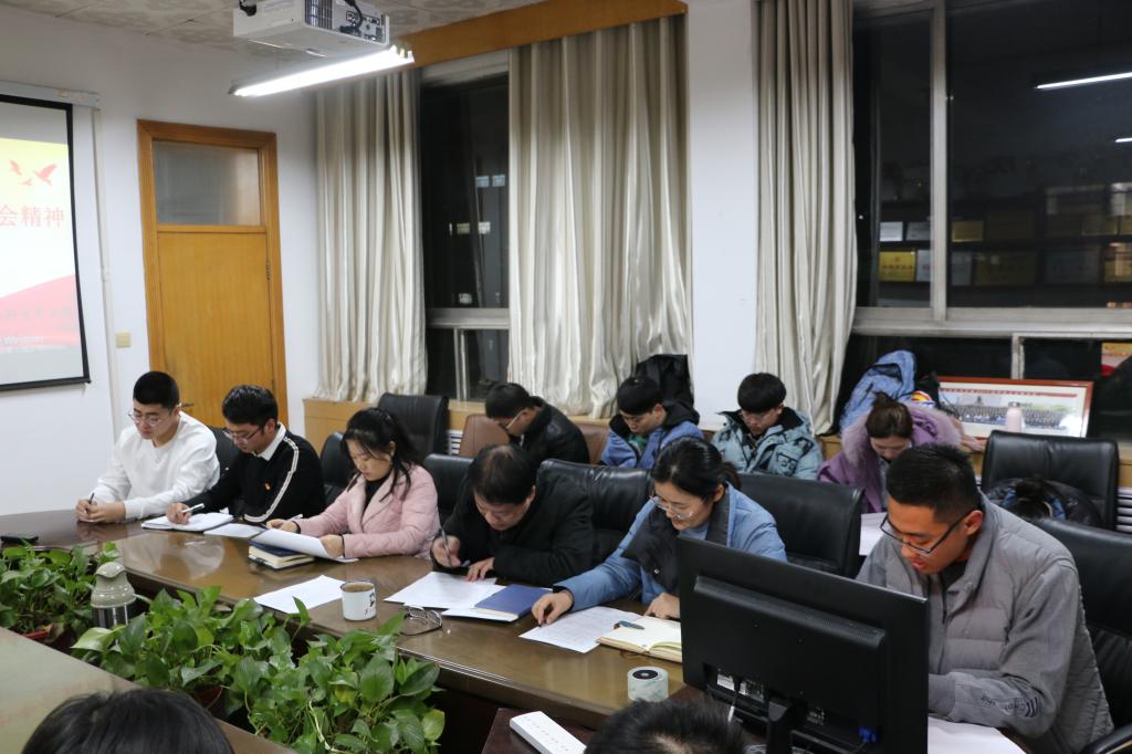 会议室举行主题党会,会议由本科生党支部书记田凯主持,武玉龙主讲,团委书记范瑞红、辅导员洪亚玲、丁允念及全体党员参加。