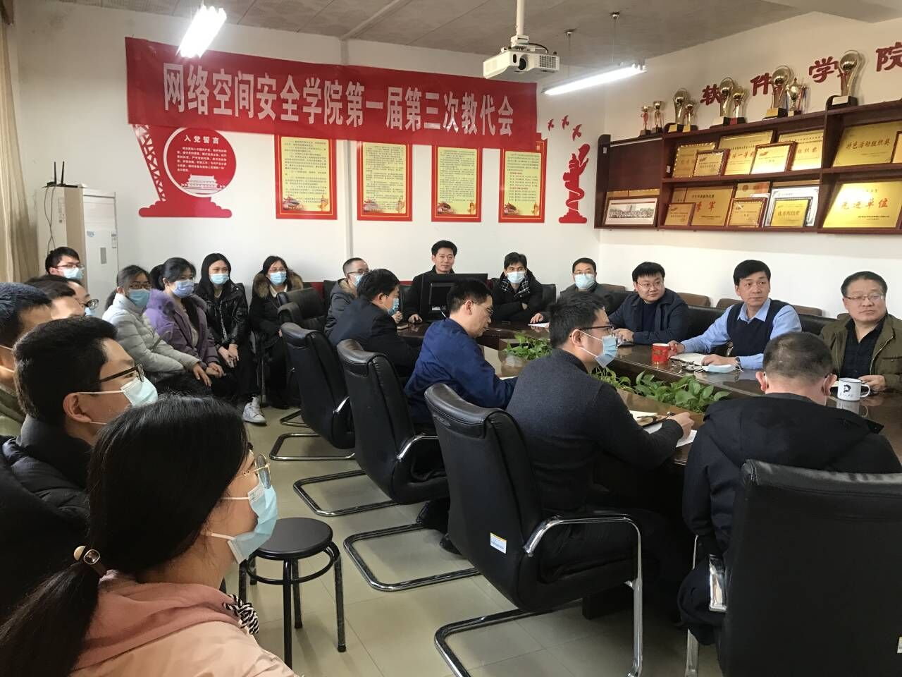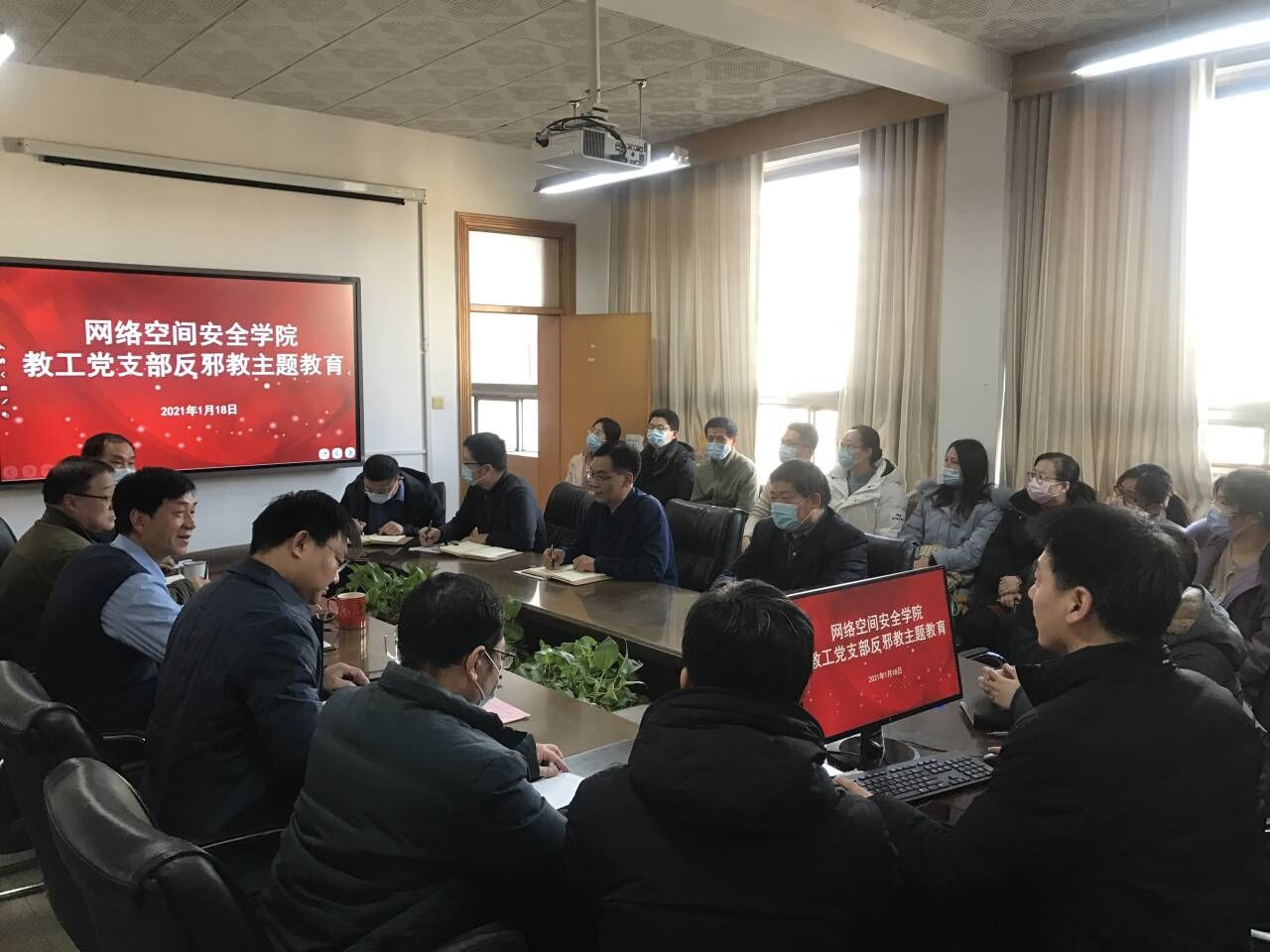 教工党支部在会议室开展反邪教主题党日活动。