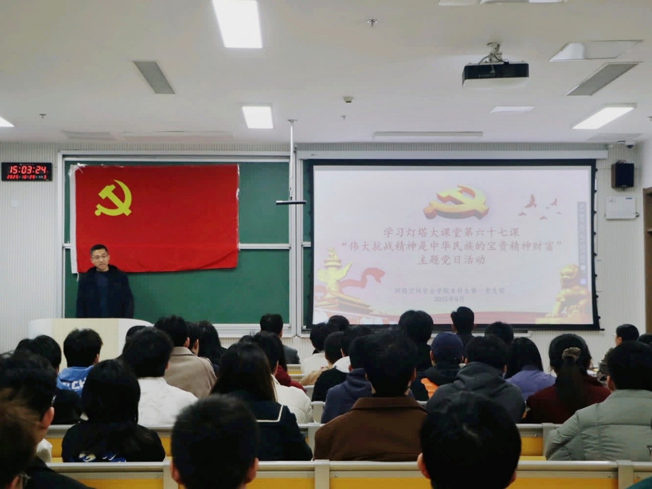 在本科生第一党支部主题党日活动中,武玉龙带领全体党员集中学习了灯塔大课堂第六十七课“伟大抗战精神是中华民族的宝贵精神财富”。本期灯塔大课堂从抗日战争胜利的历史意义、伟大抗战精神的丰富内涵和启示要求方等面作了系统解读。随后,党员们围绕伟大抗战精神的时代意义开展交流研讨,探讨了在新时代如何继承和弘扬抗战精神,充分发挥党员的先锋模范作用。武玉龙强调,全体党员要深刻领会伟大抗战精神的实质内涵,把学习成果转化为推动学习、科研和服务社会的实际行动。本科生第二党支部、本科生第三党支部分别开展了各党支部主题党日活动。