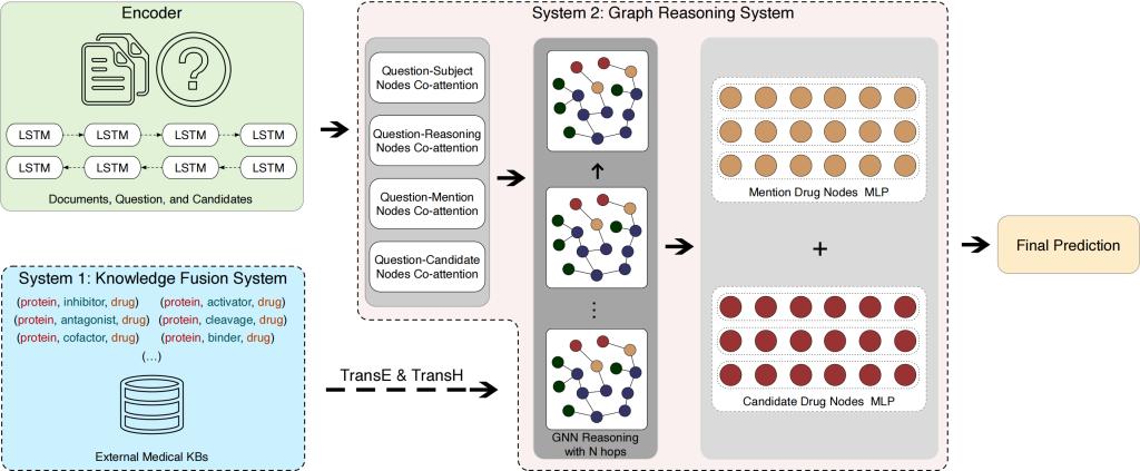 针对在封闭域文档中进行阅读理解时实体信息的缺失问题,本文研究并提出了一种应用于分子生物学文本可融合外部结构化知识到图神经网络以增补实体属性的图推理系统模型。首先,通过分析在封闭域分子生物学文献中进行对药物属性的阅读理解后预测药物间反应的任务特性,从外部知识库中收集并创建了“药物—蛋白质靶点”知识图谱。其次,通过知识图谱实体向量化的方法,将图谱中药物和蛋白质靶点属性进行向量嵌入学习,并以药物在人体环境中蛋白质靶点间代谢反应通路为指导,建立了图中药物和蛋白质等实体节点间的有向连接,实现了将多种外部知识对齐和应用于图神经网络的学习过程。实验结果表明,该模型提高了基于文本阅读理解的药物间相互反应预测的准确率,体现了模型架构设计的合理性和有效性,进一步验证了在阅读理解任务中融合外部知识的可行性。