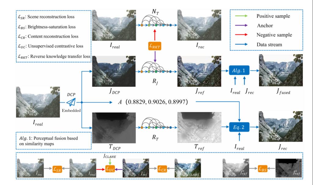 论文提出了一种新颖的零参考真实世界图像去雾方法ZRID-Net(Zero-Reference Real-World Image Dehazing Network),其核心基于深度自解耦与逆向知识迁移。具体而言,论文首先采用一种模型驱动的方法,将观测图像初步解耦为三个粗粒度成分:无雾图像、透射率图以及大气光。随后,分别通过数据驱动的方法对无雾图像与透射率图进行细化优化。此外,论文提出了一种新型的逆向知识迁移机制,充分挖掘雾化图像中的潜在先验信息,以指导去雾过程。该方法将知识迁移与对比学习相结合,从逆向角度引导细化网络远离雾特征,从而提升去雾效果。最后,论文引入了一种感知融合策略,以获得具有高可视性和真实感的无雾图像。大量实验表明ZRID-Net在定量指标与视觉质量上均优于现有的最新方法,并展现出较强的泛化能力与实际应用潜力。
