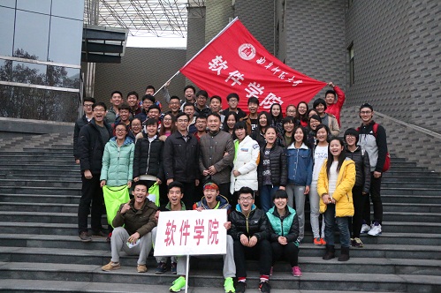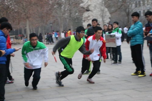 共十一支队伍齐聚大学生活动中心楼前,举办曲阜师范大学纪念“一二·九运动”八十周年校园接力赛。
