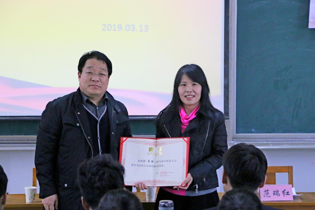 田凯书记对袁梅老师的到来表示热烈的欢迎并代表学校党委为袁梅老师颁发青年马克思主义者培养工程导师聘书。随后袁梅老师为同学们作了主题为“口才与语言表达能力提升”的精彩报告。