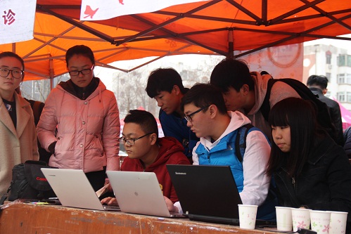 的师生义诊电脑,帮助他们重装系统,调试软件。在义诊现场,前来寻求帮助的师生络绎不绝。同学们不仅为前来义诊的师生们解决了问题,更提高了自己的专业技能知识。