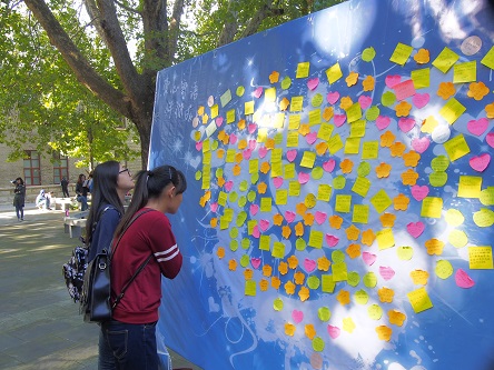 的工作使新生能更快适应大学新的学习和生活。在新生办理完入学手续后,陆续走到了我们树立的爱心寄语展板。当看到展板上父母对他们的祝福和期望时,泪水不禁涌上眼眶,和父母深情的拥抱在一起。面对即将开始的大学生活,他们正满怀对着未来的憧憬,带着父母的爱和期待开始自己独立自主的新生活。