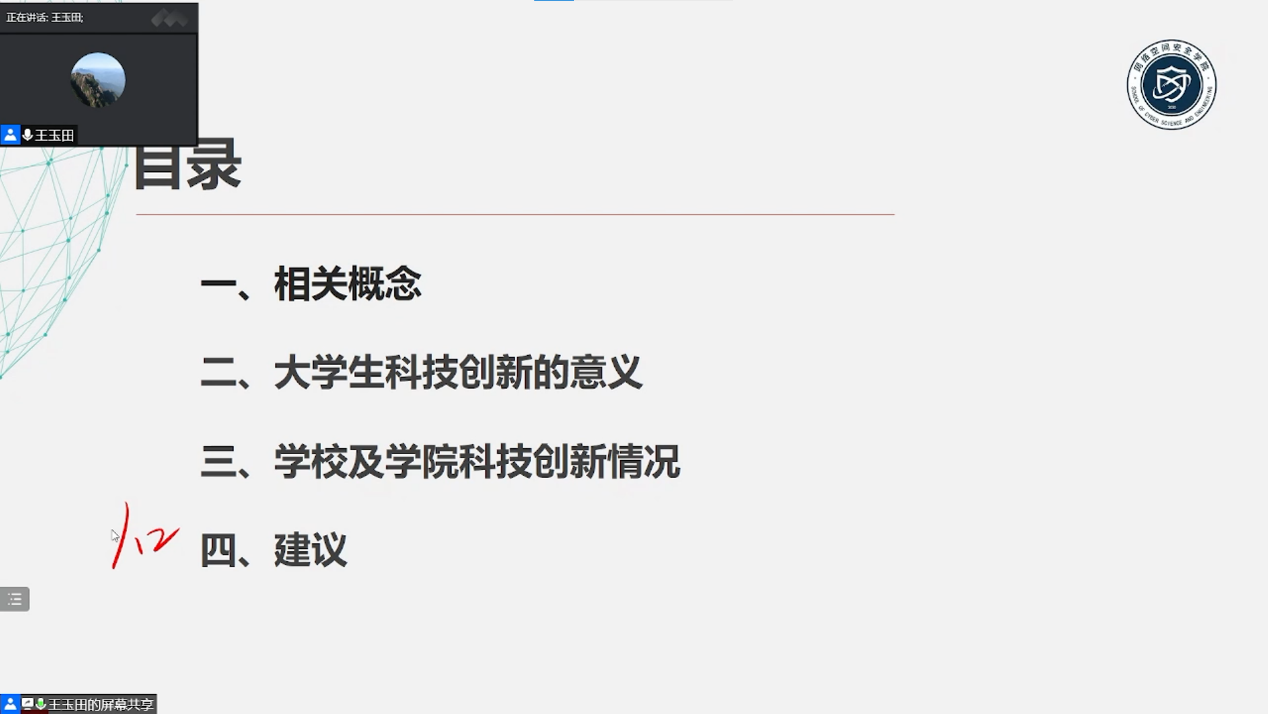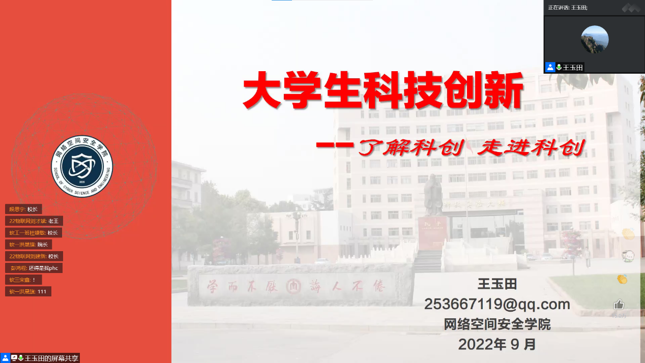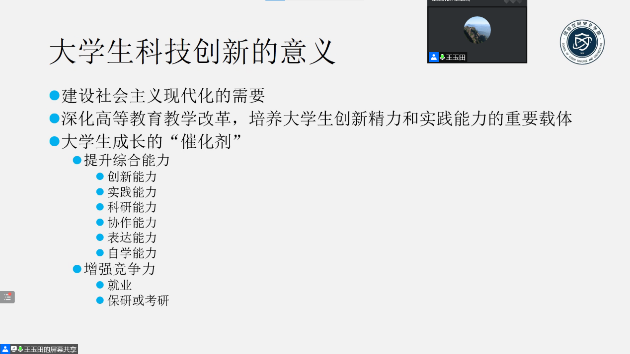 的科技创新成果、获奖情况,并向同学们解读了相关竞赛的奖励政策。王玉田强调,科技创新是引领发展的第一动力,积极参与科技创新的意义不仅在于提升自身综合能力和核心竞争力,更是建设社会主义现代化的需要。最后,王玉田向有意参与创新竞赛的同学们提出了相关建议,鼓励同学们学以致用,将理论与实践相结合,积极投入到科技创新当中。