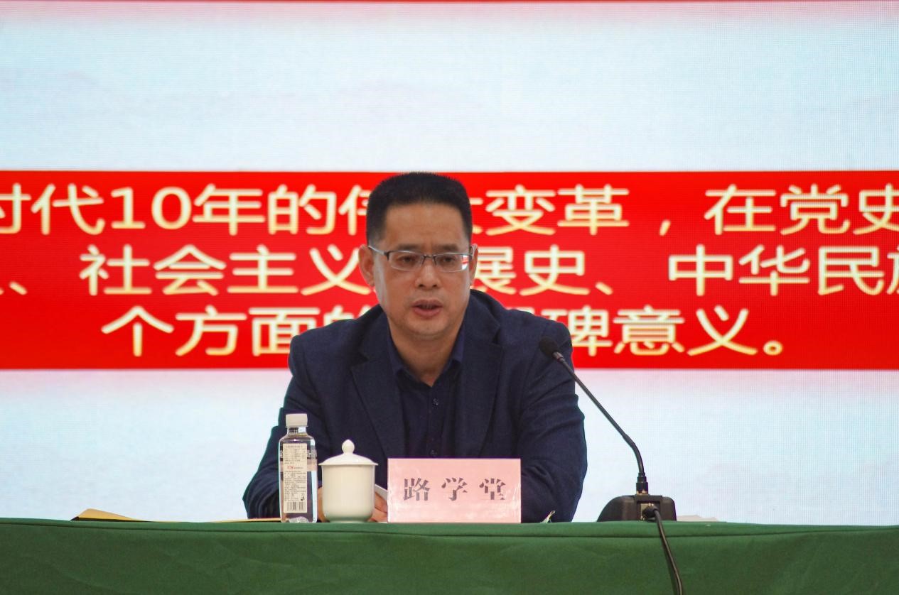路学堂结合自己的学习和感悟,从党的二十大主题、主要成果和重大意义、过去5年工作和新时代10年伟大变革、中国式现代化、坚持党的全面领导和全面从严治党、应对风险挑战等七方面宣讲党的二十大精神。路学堂指出,党员干部要把捍卫“两个确立”、做到“两个维护”落到实处,要抓好全面从严治党各项任务落实,加强高素质干部队伍、人才队伍建设,同时始终保持反腐败斗争高压态势,推动全面从严治党向纵深发展。