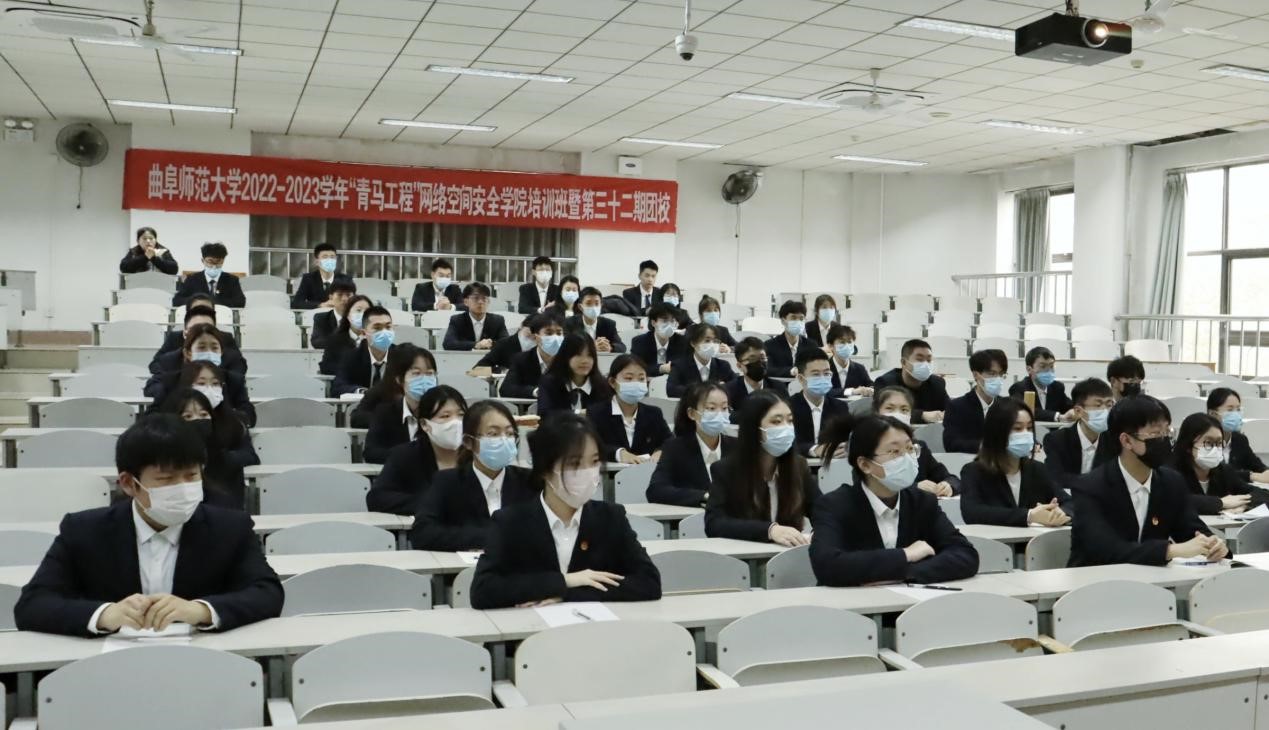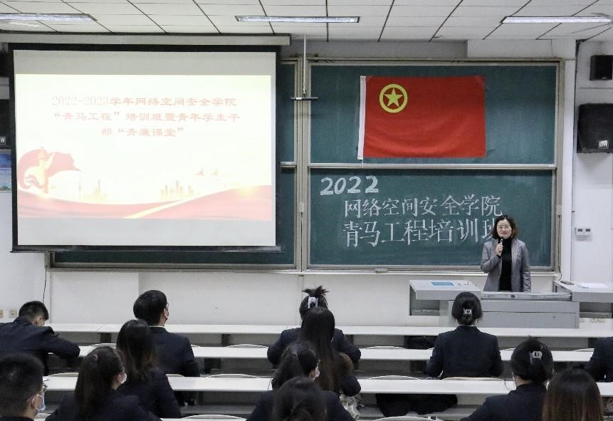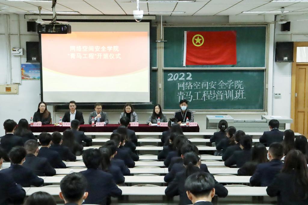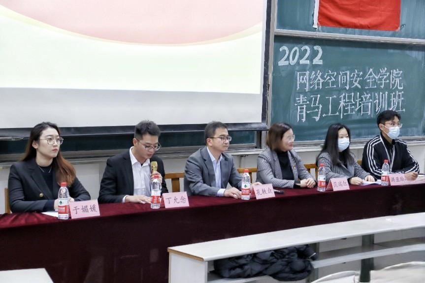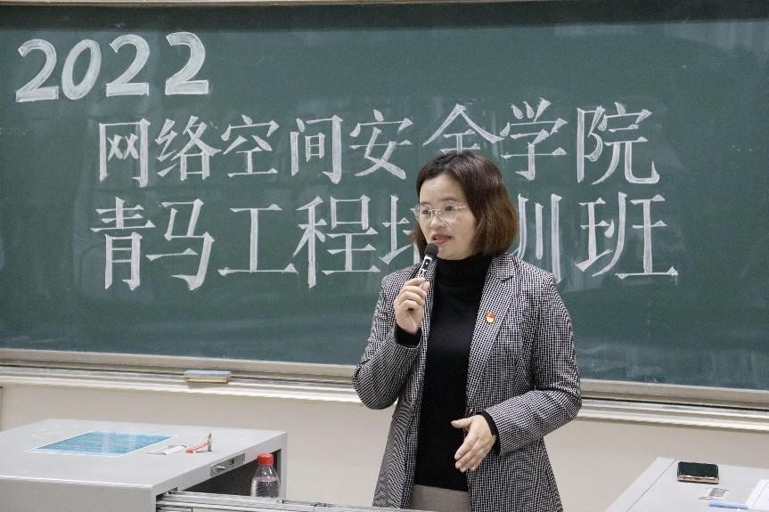 2022-2023学年青马工程培训计划,对培训对象、培训时间、培训要求等内容进行详细阐述,勉励同学们听党话、跟党走,提升自身政治素养。最后,2021级网络空间安全班团支部书记韩菲作为学员代表进行发言,她向同学们倡议保持崇高理想,跟进了解时事,展现新时代青年坚定的理想信念。