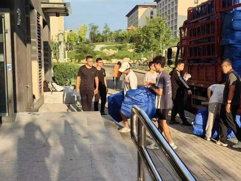 辅导员老师们到西区1号楼和2号楼,组织2022级、2023级学生志愿者参与新生被褥的搬运工作。