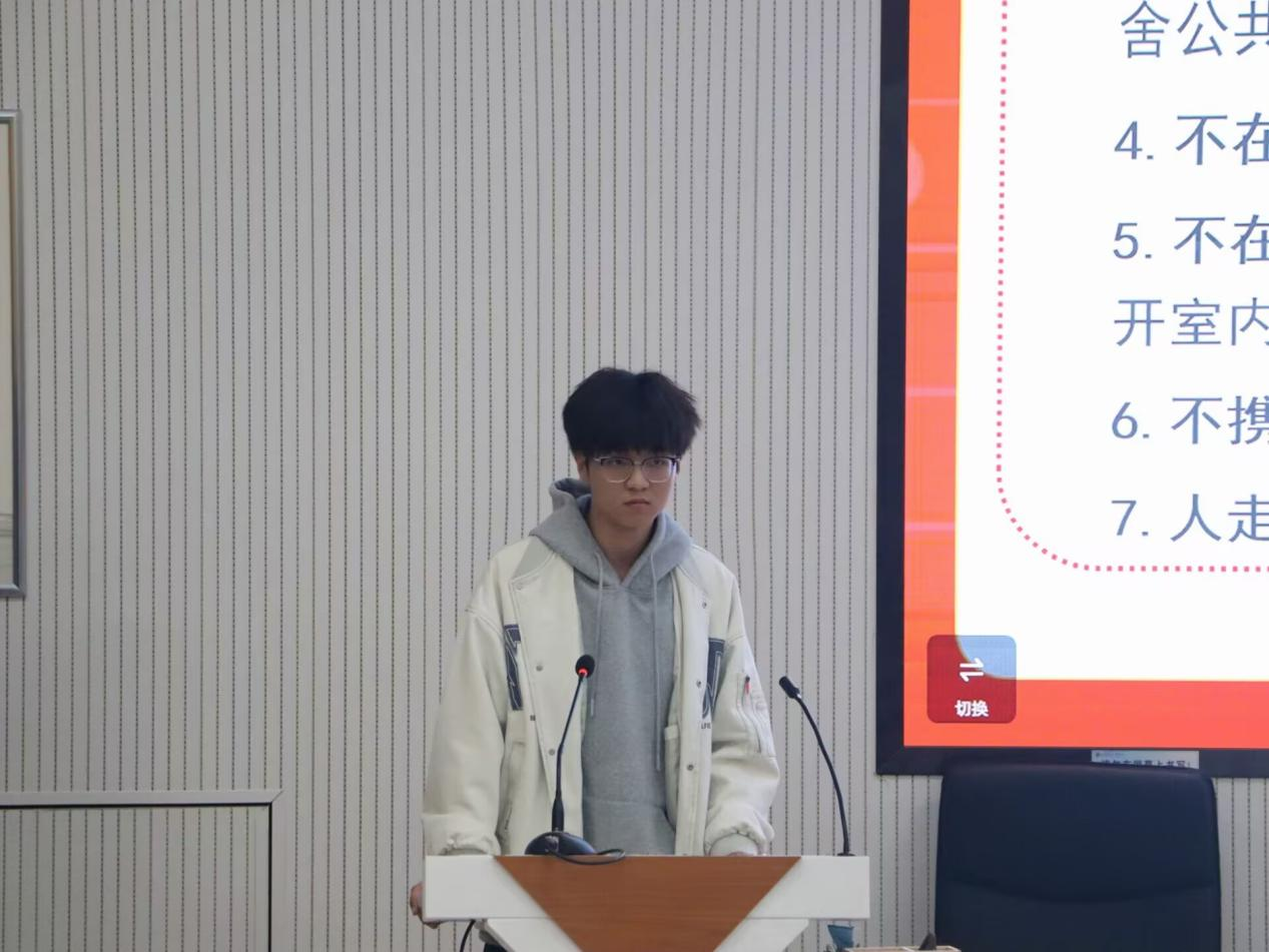会议伊始,主讲人播放了齐鲁工业大学宿舍火灾视频,让宿舍长了解到火灾的危害。随后带领全体寝舍长学习了寝室火源的五大源头,并违规电器做出了详细的罗列。主讲人强调:不仅要不触线,还要防的好,全体学生要成为寝室防火的追光者、责任与担当的践行者。随后两位副部带领大家重申了不要将台灯靠近枕头、被褥和蚊帐,不要在宿舍内使用违规电器,人走断电等七条原则。最后,主讲人播放了学校宿舍楼火灾案例和宿舍防火措施有关的视频,极大的加深了宿舍长的印象,激起舍长对防火的重视,为防火措施的工作开展奠基。