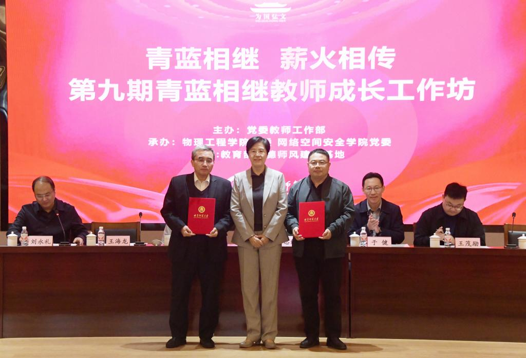 物理工程乐球直播 王海龙教授、乐球直播官网 周子力副教授受聘第九批“青年教师成长导师”,李志红为两位成长导师颁发证书。