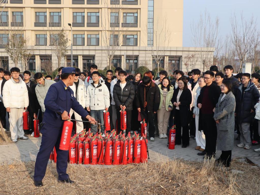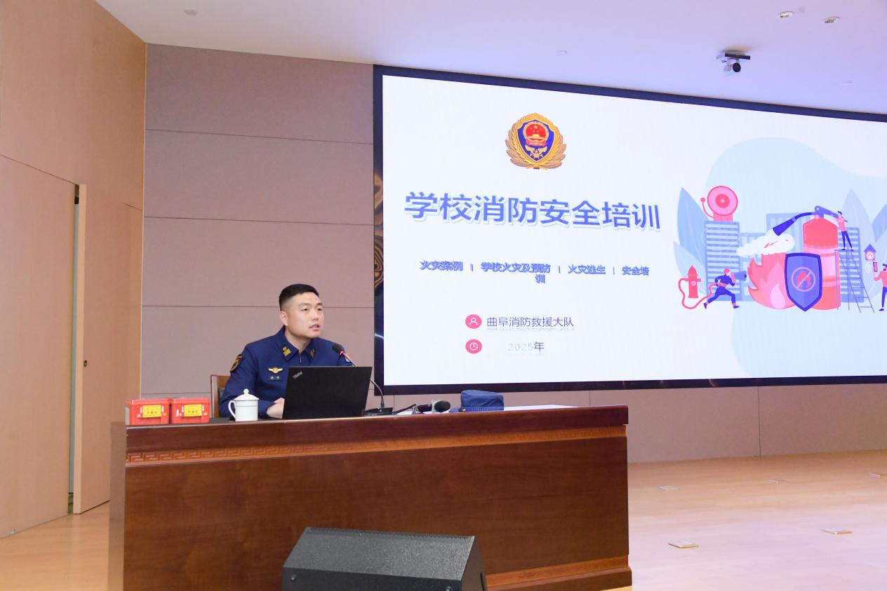 本次培训特邀曲阜市消防大队三孔消防救援站站长王磊进行学校消防安全培训。王磊从校园火灾预防注意事项、初起火灾处置方法、火场逃生技巧等方面出发,通过视频案例、现场讲解和实战演练等多种形式,生动形象地向同学们传授了消防安全知识和技能。