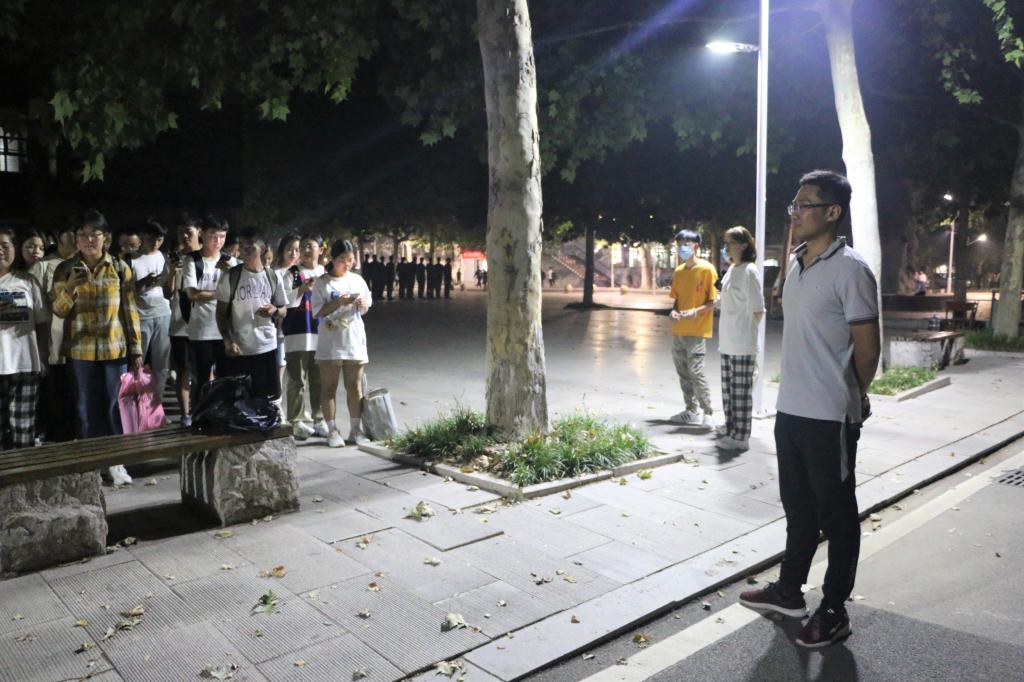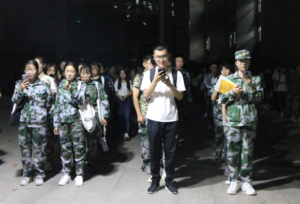 合唱开始前,同学们在大学生活动中心认真背诵歌词,部分同学积极竞选合唱指挥,展现自己的风采。在武老师和大艺团同学的带领下,随着“走向复兴”音乐的响起,激情昂扬的同学们迅速进入状态,气势高昂、奋发有力的歌声响彻整个场地。结束了一天的军训,紧张的氛围变得轻松欢快,这使得同学们养精蓄锐,为第二天的训练打下了基础。