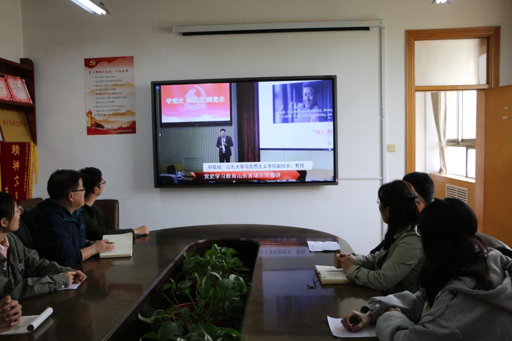 在会议室组织收看由山东大学举办的“青春向党 奋斗强国”省级首场示范宣讲,党委副书记田凯,团委书记范瑞红,辅导员武玉龙、丁允念参加。