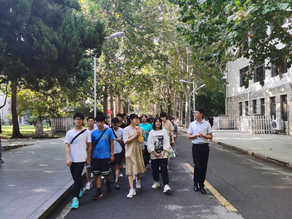 辅导员丁允念、于媚媛组织新生参观校园,介绍曲园的特色建筑。
