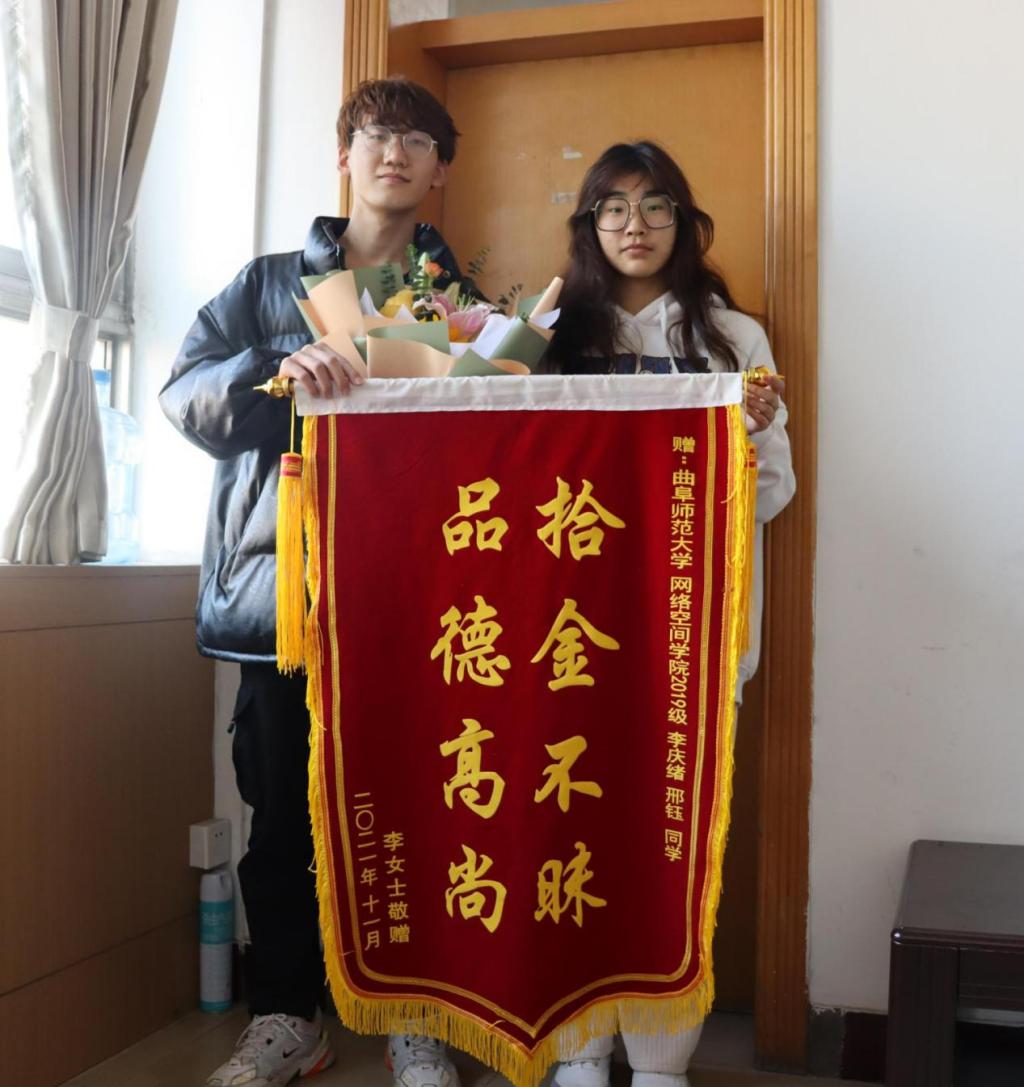 经了解,2021年11月21日晚上,李庆绪和邢钰两位同学在曲阜市蓝海影城附近捡到了苹果手机一部。该手机市场价值九千余元,李庆绪与邢钰捡到手机后,不为钱财所动,第一时间想到的是失主发现手机丢失后的焦急心情,便等待失主返回寻找。最终李女士打来电话,两名同学与失主李女士取得联系,将手机物归原主。就有了上面的一幕,社会人士李女士专程来到乐球直播官网