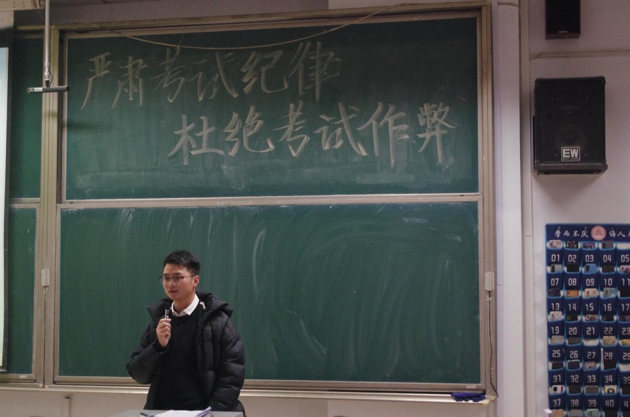 在主题班会上,丁允念主要围绕学生的期末考试复习准备、考试心态、考风考纪的严肃性和重要性、考试作弊违纪处分教育以及考试作弊的危害等方面进行展开,鼓励同学们以拼搏进取的精神,全面、认真地开展复习,诚实、冷静地迎接期末考试,树立优良学风、实现零作弊。同时,丁允念向学生们着重强调了考风考纪问题,阐述考试作弊带来的处分结果对考生未来的影响,使学生能充分认识到考试的严肃性和考试违纪、舞弊的危害性,从而达成诚信考试和自觉杜绝作弊的共识。