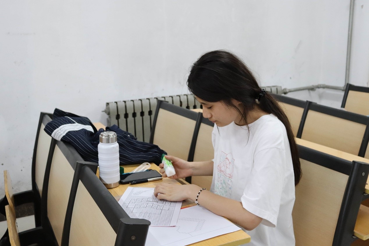 活动伊始,赵西宏介绍了本次教学活动的主题——纸雕。她通过PTT向同学们展示了纸雕的起源以及发展过程,并亲自动手进行示范,向学员们展示剪刀与刻刀的使用方法和剪纸技巧。随后,赵西宏向学员们分配剪纸任务,让大家亲自参与纸雕的制作过程中。学员们热情高涨,积极参与剪纸创作,他们专注、细腻,认真刻画绘纸,完成一幅又一幅惟妙惟肖的作品。