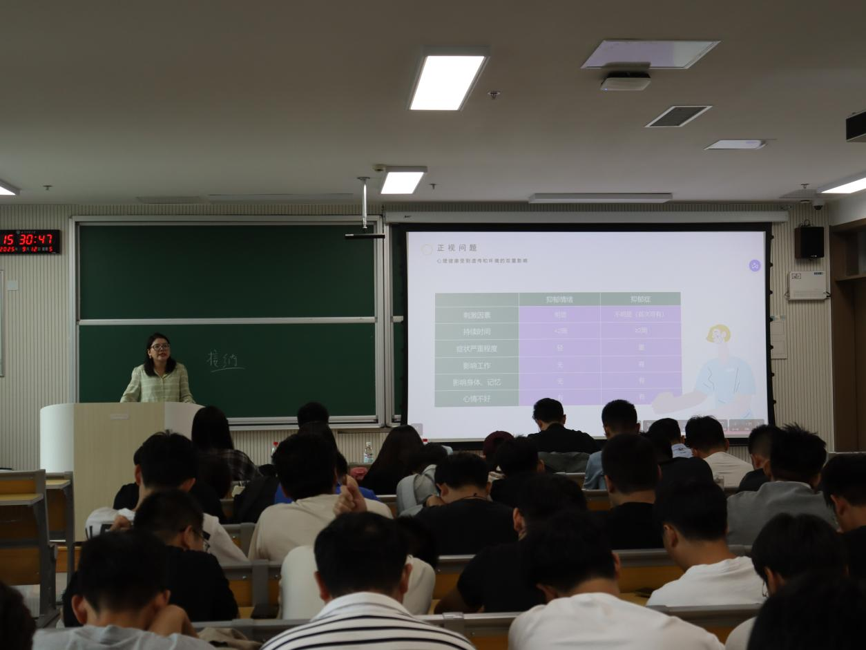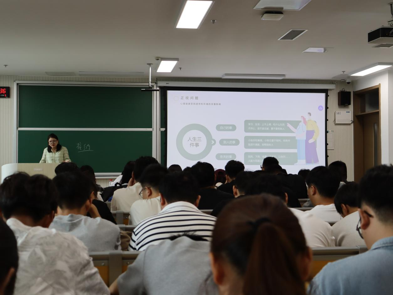 相青结合研究生阶段的学习特点与生活节奏,针对新生可能面临的学业压力、社交焦虑、目标迷茫等常见问题,结合真实案例进行深入剖析,用通俗易懂的语言让新生们了解心理问题产生的原因与表现。她指出,同学们要以积极的态度对待心理健康问题,能够正确认识和接纳可能出现的心理困扰,并学会初步判断自己是否存在心理问题。一旦有需要,应及时向专业机构或正规医院寻求帮助,在科学指导下更好地维护身心健康。同时也向大家全面介绍了学校心理健康教育与咨询中心的服务内容、预约方式等,为新生构建了全方位的心理支持网络。
