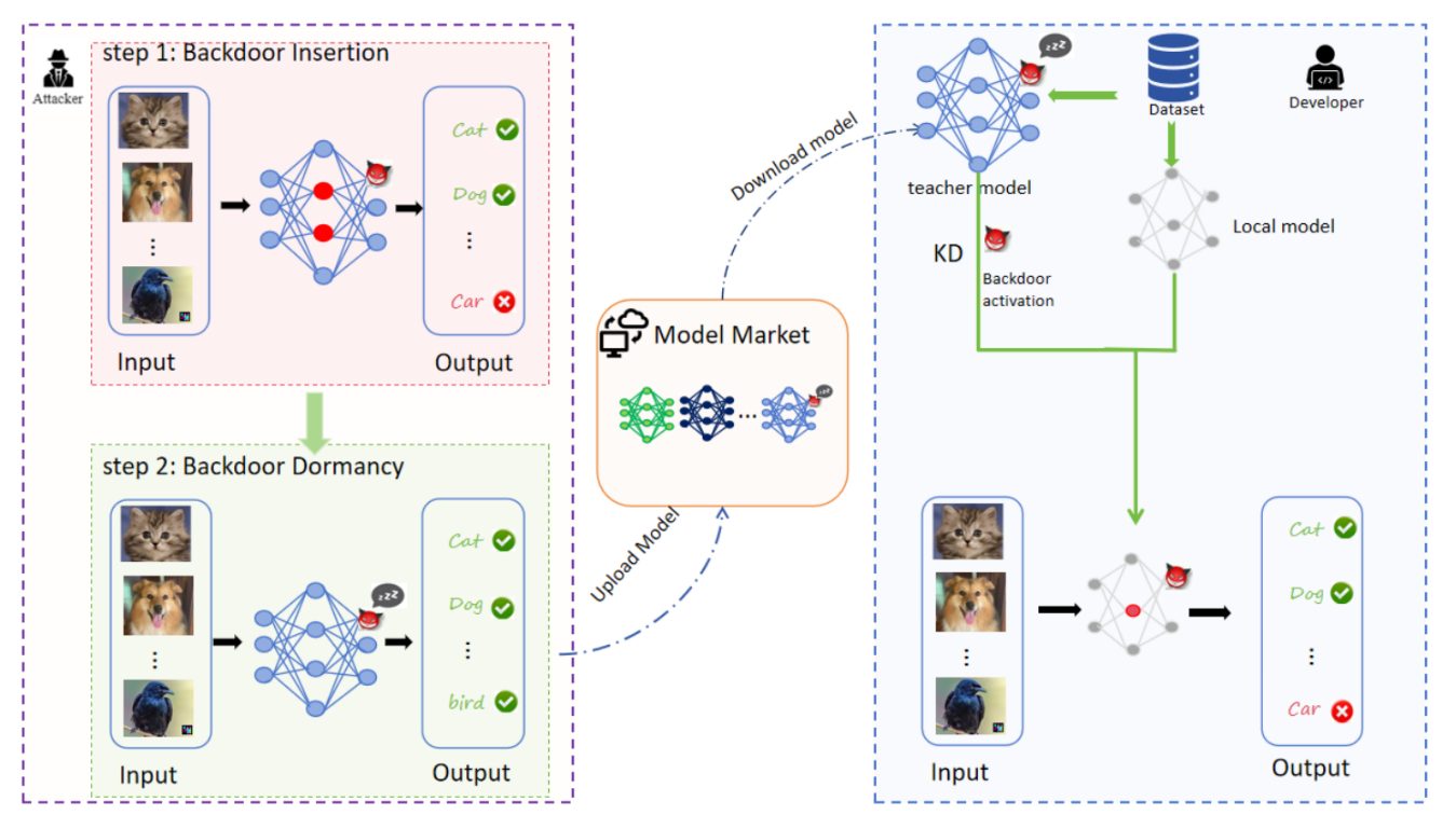 图1 迁移休眠后门:通过知识蒸馏在预训练模型中嵌入隐蔽可迁移嵌入后门